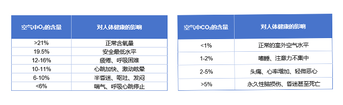 科学研究表明,在标准大气压下,车舱内的气体变化具有特殊性。空气中氧气的正常含量是21%,对人体产生影响的临界值为19.5%,低于临界值人体易呼吸加速感到疲劳无力,浓度越低人体危害越大。CO2在空气中的正常含量是0.04%,对人体产生影响的临界值为1%,浓度高于1%人就会感到嗜睡、注意力不集中,若高于5%则出现昏迷甚至死亡[1,3,4]。
