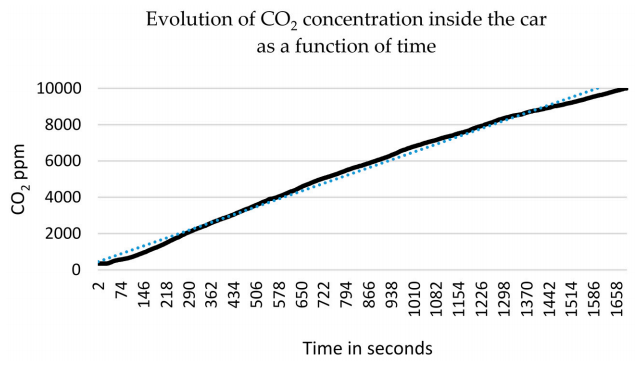 研究表明,成年人静息状态下,每分钟消耗约0.3L O2,同时呼出约0.25L CO2。当一位成年人坐在内部容积3.5 m³且车窗关闭内循环开启的轿车中,氧气浓度从21%(正常值)以每小时约0.4%的速率下降,同时CO2浓度也由0.04%(正常值)以每小时约0.34%的速率上升。3小时后,CO2浓度迅速上升至1.02%,超过危险临界值1%,此时氧气的浓度为19.8%,仍高于氧气浓度的危险临界值19.5%[2,3]。