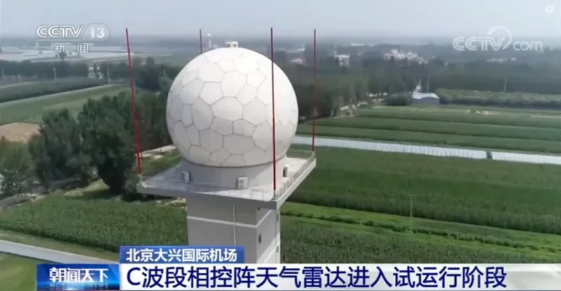 ▲北京大兴机场C波段全数字有源相控阵气象雷达进入试运行阶段,截图来源:央视新闻频道朝闻天下节目