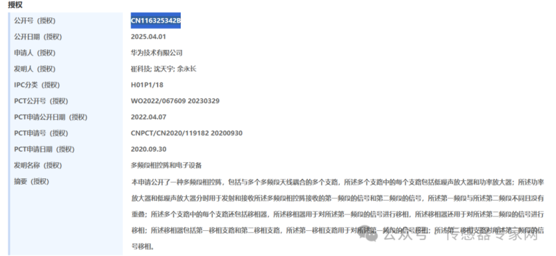 多篇报道中,引用了华为在今年4月份公开的【CN116325342B】号专利,专利名称为“多频段相控阵和电子设备”,据专利介绍摘要显示: