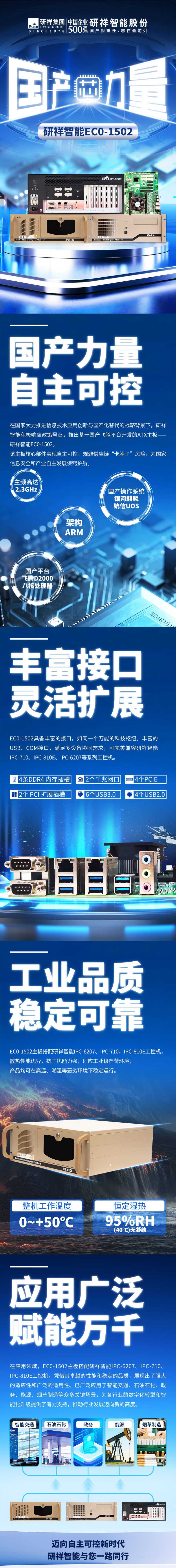在应用领域,EC0-1502主板搭配研祥智能IPC-6207、IPC-710、IPC-810E工控机,凭借其卓越的性能和稳定的品质,展现出了强大的适应性和广泛的适用性。已广泛应用于智能交通、石油石化、政务、能源、烟草制造等众多关键场景,为各行业的数字化转型和智能化升级提供了有力支持,推动行业发展迈向新的高度。