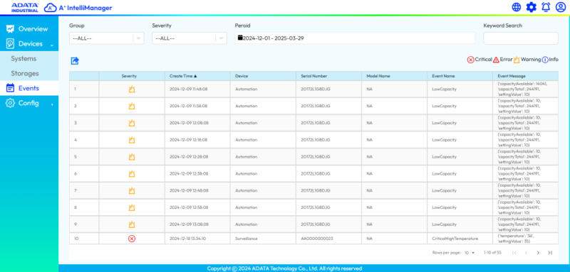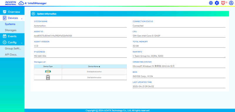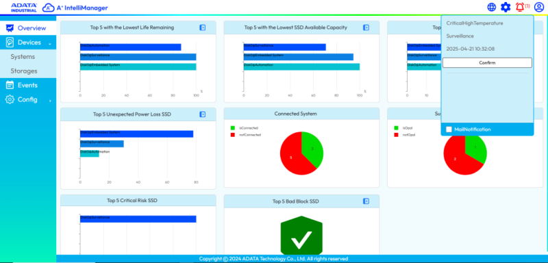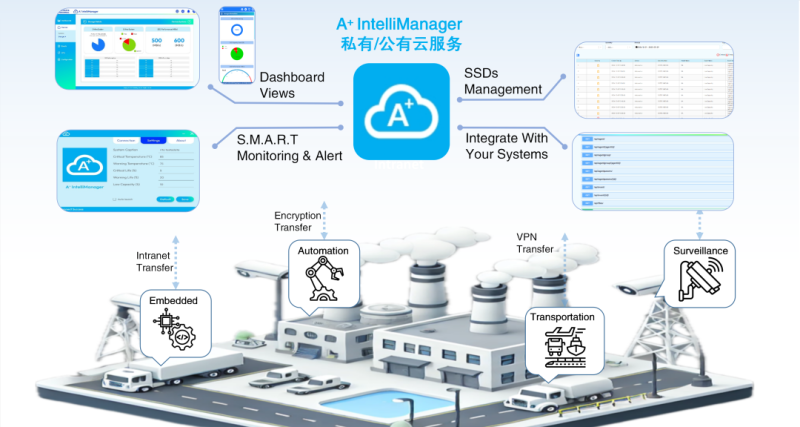 基于对行业痛点的深度洞察,威刚推出的A+ IntelliManager软件是一套为工业级SSD提供的云端管理平台,使用者可安装在私有云或是公有云上,随时随地集中管理、监控多台设备中的SSD温度、使用容量、寿命、状态、系统参数等,实现大规模终端设备的维护,并确保核心主机与设备之间的数据可顺畅流通。