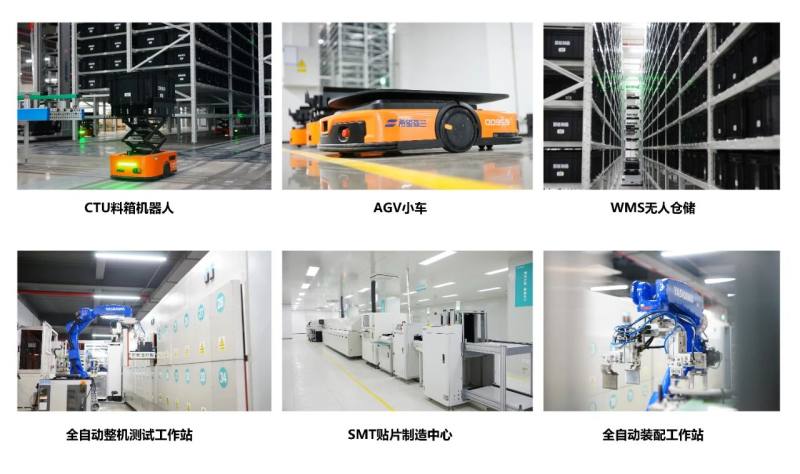 装备智能,质效双升:生产线配备了代表国际先进水平的SMT贴片机、工业机器人、AGV小车、CTU料箱机器人、自动测试机、自动涂覆机、柔性装配线等高智能化设备集群。这不仅有效降低了人工依赖,大幅提升了生产效率,更实现了生产全过程的质量精准管控与追溯,显著增强了车间的管理水平和创新能力。