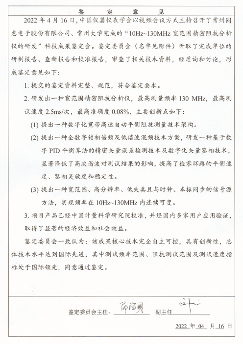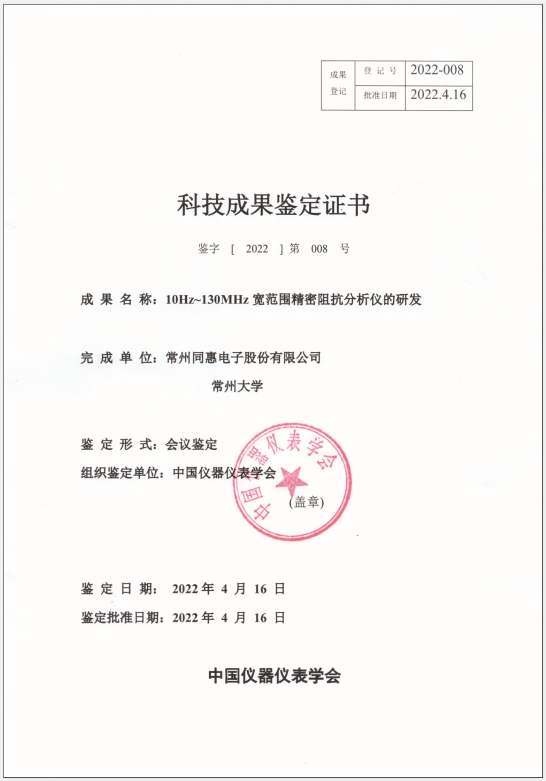 2022年4月16日,中国仪器仪表学会组织行业专家,对同惠10Hz-130MHz宽范围精密阻抗分析仪进行了项目成果鉴定,“鉴定委员会一致认为:该成果核心技术完全自主可控,具有创新性,总体技术水平达到国际先进,其中测试频率范围、阻抗测试范围及测试速度指标处于国际领先,同意通过鉴定。”