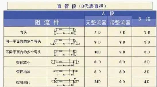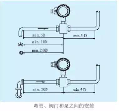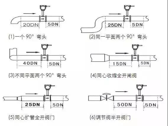 传感器的管道轴心应与相邻管道轴心对准,连接密封用的垫圈不得深入管道内腔。不同情况下的直管段要求如下图。