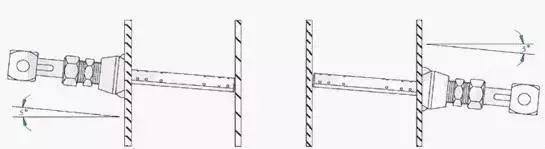 对于垂直管道,理论上可以在360度内安装。对于含有大量水分的湿气体,推荐传感器安装时向上倾斜5度,如左图所示。
