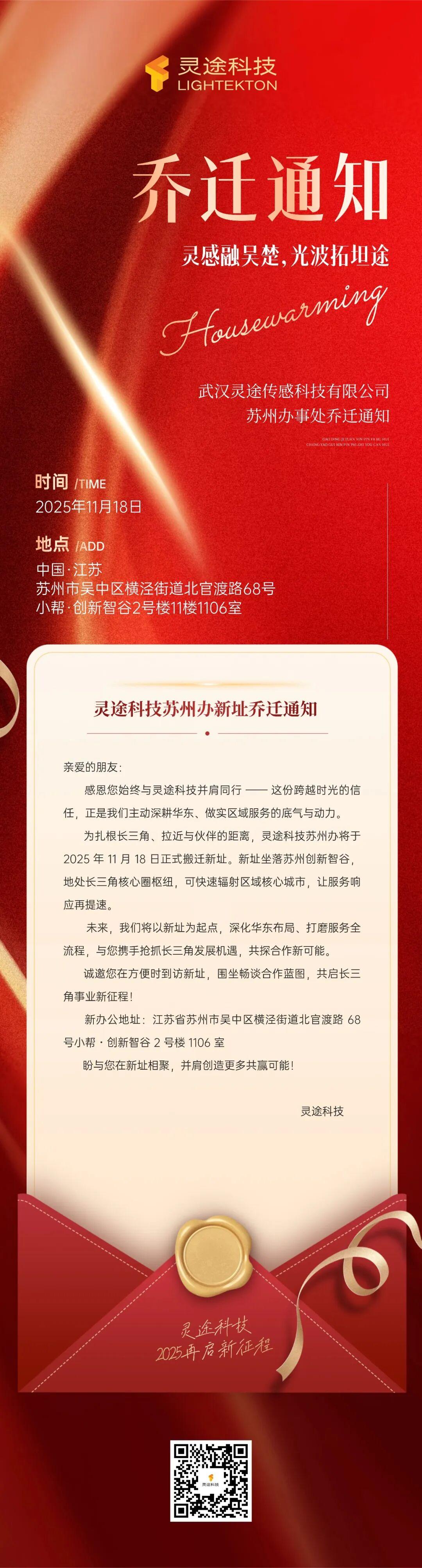 为扎根长三角、拉近与伙伴的距离,灵途科技苏州办将于2025 年11月18 日正式搬迁新址。新址坐落苏州创新智谷地处长三角核心圈枢纽,可快速辐射区域核心城市,让服务响应再提速
