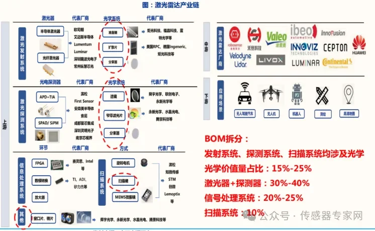激光雷达LiDAR关键部件按照信号处理的信号链包括控制硬件DSP(数字信号处理器)、激光驱动、激光发射发光二极管、发射光学镜头、接收光学镜头、APD(雪崩光学二极管)、TIA(可变跨导放大器)和探测器。其中除了发射和接收光学镜头外,都是电子部件。随着半导体技术的快速演进,性能逐步提升的同时成本迅速降低。但是光学组件和旋转机械则占据了激光雷达的大部分成本。