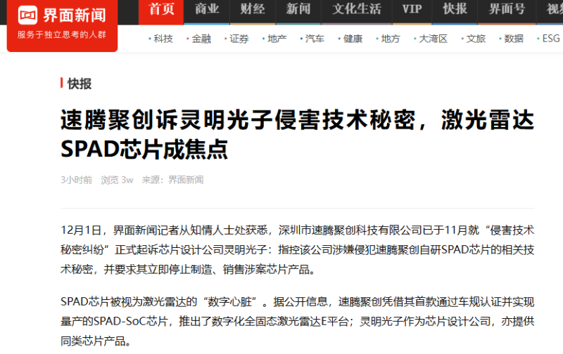 (12月1日),据界面新闻爆出,从知情人士处获悉,深圳市速腾聚创科技有限公司已于11月就“侵害技术秘密纠纷”正式起诉芯片设计公司灵明光子:指控该公司涉嫌侵犯速腾聚创自研SPAD芯片的相关技术秘密,并要求其立即停止制造、销售涉案芯片产品。