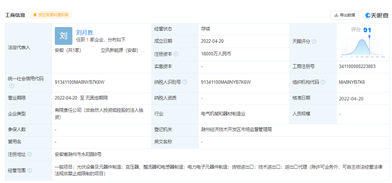 天眼查显示,立讯精密斥资1.8亿元在安徽省滁州市成立新能源公司(立讯新能源(安徽)有限公司),成立日期为2022年4月20日。