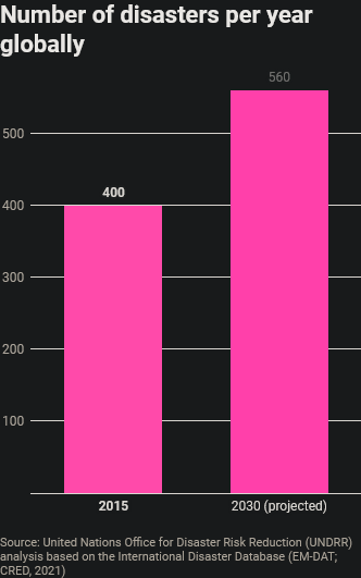 如果人类方面没有改变,2030 年可能会更加惨淡。例如,与极端温度有关的灾害发生频率可能比 2001 年增加三倍。联合国报告预计灾害数量将增加到每年约 560 起,或每天约 1.5 起灾害。