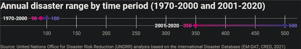 根据联合国减少灾害风险办公室(UNDRR)今天(4 月 27 日)发布的报告,回顾过去,从 1970 年到 2000 年,世界平均每年报告 90 到 100 起灾害。从 2001 年到 2020 年,这一数字大幅增长,每年发生 350 到 500 起灾难。