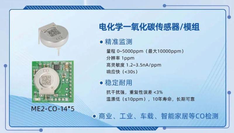 从性能上看,传感器能在30秒内对0-5000ppm浓度(最高10000ppm)的一氧化碳气体做出响应,具有低功耗、高精度、高灵敏度、线性范围宽、抗干扰能力强、优异的重复性和稳定性等特性。