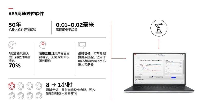 ABB全新机器人高速对位软件借助视觉技术取得突破性进展,将机器人在产品精密组装应用中视觉对位速度提升达70%,精度提升达50%