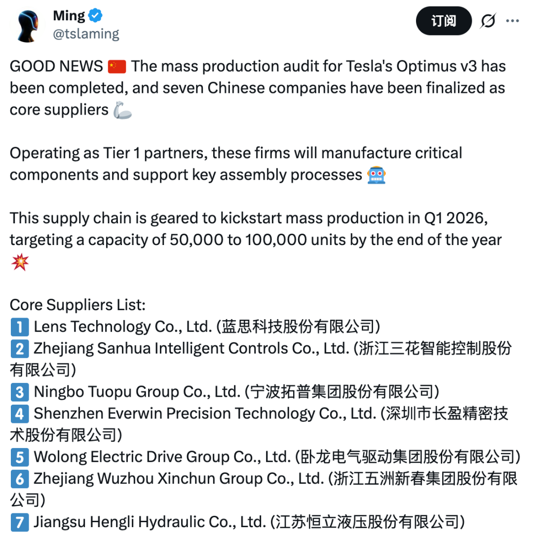 近期,关于Optimus V3量产审核完成、七家中国企业确定为核心一级供应商的消息引发行业震动。这7家公司分别为:蓝思科技、三花智控、拓普集团、长盈精密、卧龙电驱、五洲新春、恒立液压。