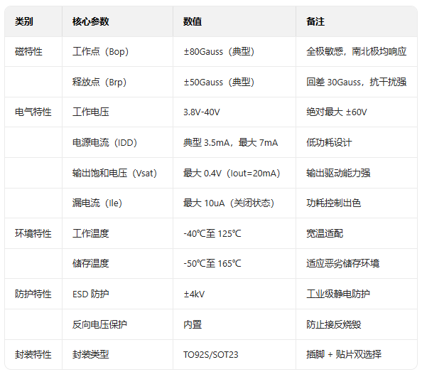 在灵敏度表现上,JSM451 与 SS451A 一致,工作点 Bop 典型值为 ±80Gauss,释放点 Brp 典型值为 ±50Gauss,30Gauss 的回差设计有效避免磁场波动导致的输出抖动,确保信号检测的稳定性。无论是南极还是北极磁场靠近,都能快速响应,输出精准电平信号,完全满足全极传感的应用需求。