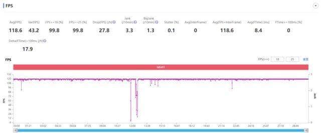 从帧率图可知,游戏平均帧率为118.6帧,表现非常出色,除了切换对局时出现的短暂掉帧之外,其余游戏时间帧率基本稳定在120帧,即使遇到团战画面也能保持稳定不掉帧,体验可以说是非常畅快。