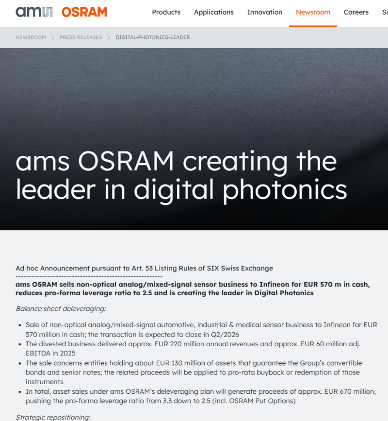 同日,艾迈斯欧司朗(ams OSRAM)发布新闻稿称,以 5.7 亿欧元现金将非光学模拟/混合信号传感器业务出售给英飞凌,将聚焦打造数字光子学领域的领导者。