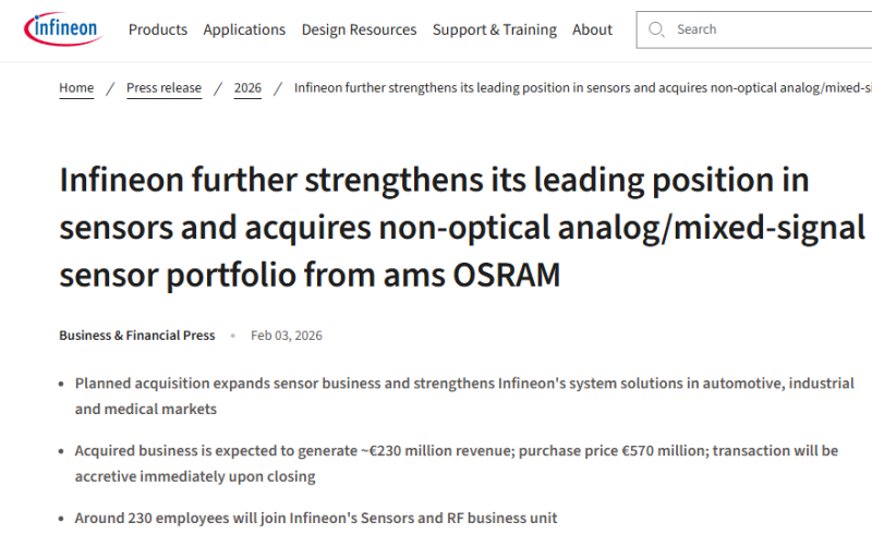 双方已达成协议,收购价格为 5.7 亿欧元,且不涉及债务和现金。通过此次收购,英飞凌将凭借互补的产品组合,巩固其在汽车和工业市场传感器领域的领先地位,并拓展其在医疗应用领域的产品范围。预计此次收购的业务将在 2026 年创造约 2.3 亿欧元的收入,并助力英飞凌实现盈利增长。交易完成后,每股收益将立即提升,未来的协同效应还将带来可观的额外价值。作为交易的一部分,约 230 名拥有研发和业务管理经验的员工将加入英飞凌。该协议包括与 ams OSRAM 签订的多年供货协议。