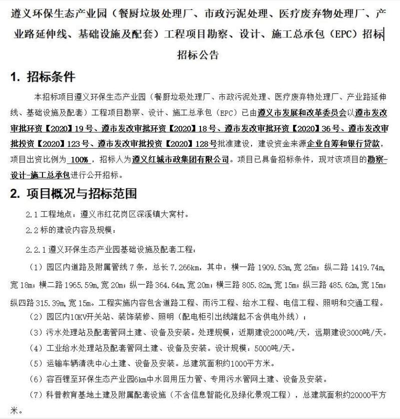 4月25日,遵义环保生态产业园(餐厨垃圾处理厂、市政污泥处理、医疗废弃物处理厂、产业路延伸线、基础设施及配套)工程项目正式招标。
