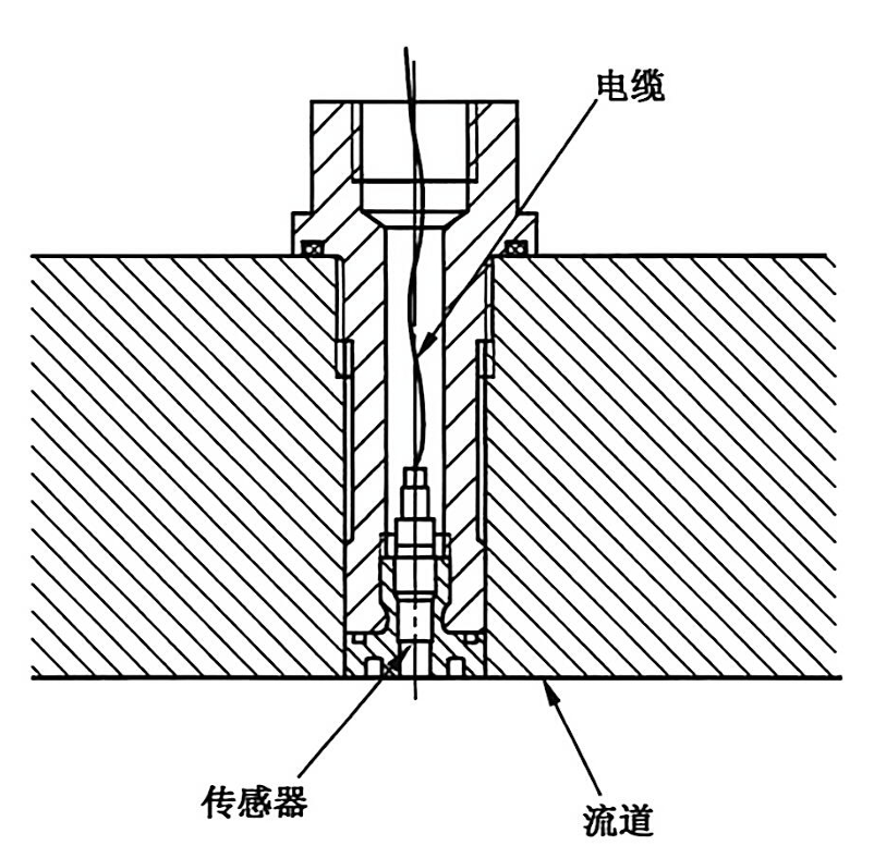安装时需保证传感器测量面与流道表面平齐,传感器和测点安装孔之间存在的任何空腔可能会引发共振,并对测量信号产生严重干扰。如无法实现齐平安装,需尽可能减小传感器感压面与流道之间的测压管长度,同时增强测压管刚度(如下图)