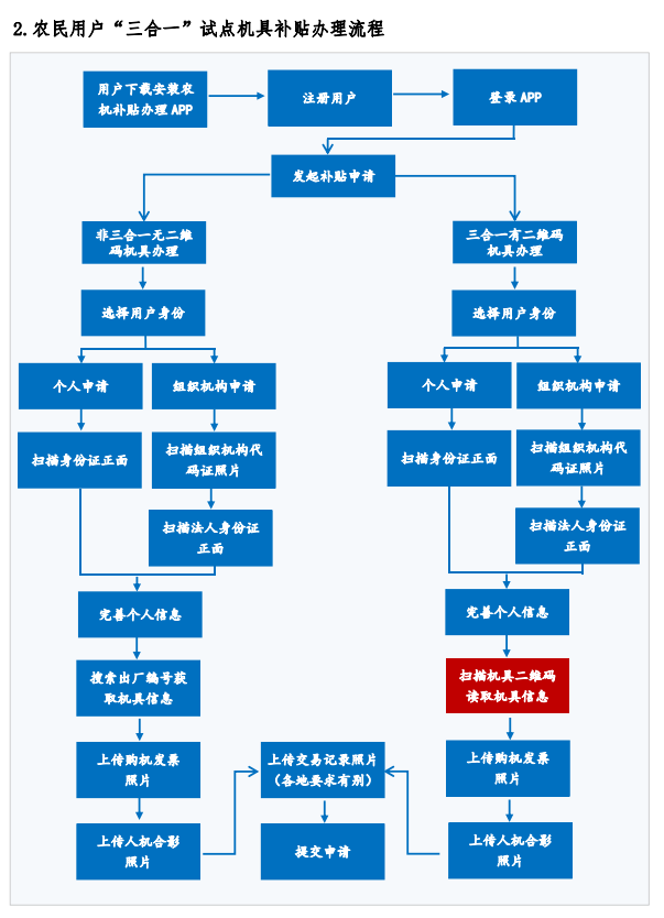 为提升风险防控技术化手段,加快推进农机购置补贴全流程线上办理,近日,广西壮族自治区农业农村厅发布《关于稳步实施农机购置补贴“三合一”办理方式的通知》(以下简称《通知》),决定对部分机具购置补贴实行“三合一”办理,即机具出厂前需生成唯一身份二维码并安装在机具铭牌位置、加装能够对机具进行定位的北斗定位终端并将数据上传到物联网辅助管理系统、通过手机APP能够扫描机具身份二维码办理补贴。
