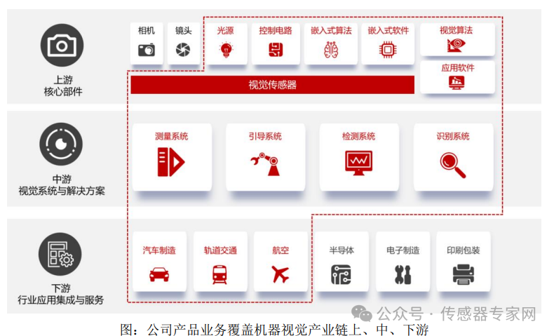 易思维的机器视觉产业链包括上游核心部件、中游视觉系统与解决方案、下游行业应用集成与服务,形成了视觉传感器研制、视觉系统构建、视觉工艺融合三大核心技术群。