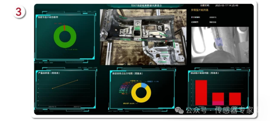 以涂胶质量检测系统为例,公司主要交付的产品为传感器(下图“①”部 分),安装在汽车制造产线机器人的胶枪上,以及控制系统(下图“②”部 分),通常放置于相应工位的围挡旁。控制系统中搭载了公司开发的涂胶检测、 数据上传等软件(软件工作界面如下图“③”部分所示)。公司涂胶质量检测 系统主要交付软硬件情况如下图: