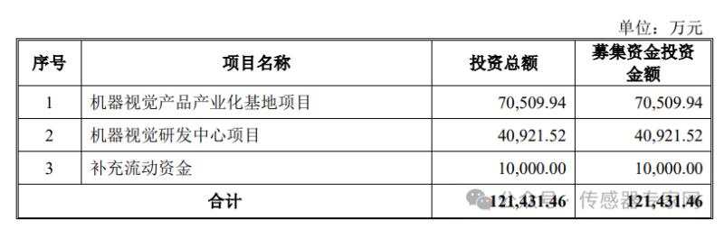 募集资金用途方面,本次IPO易思维拟募集资金12.14亿元,主要用于机器视觉产品产业化基地项目、机器视觉研发 中心项目及补充流动资金。