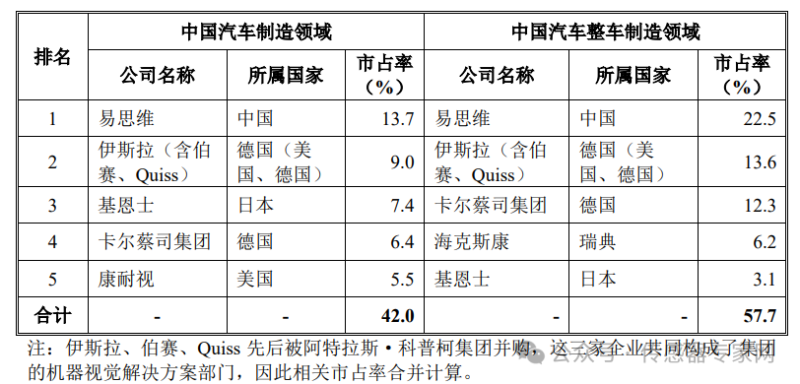 从汽车机器视觉技术的TOP5公司情况看,易思维的竞争对手均为成立多年的多家巨头公司,包括伊斯拉、基恩士、卡尔蔡司、康耐视等在工业传感器及自动化仪器仪表领域鼎鼎大名的公司,多家公司成立时间在40年以上。