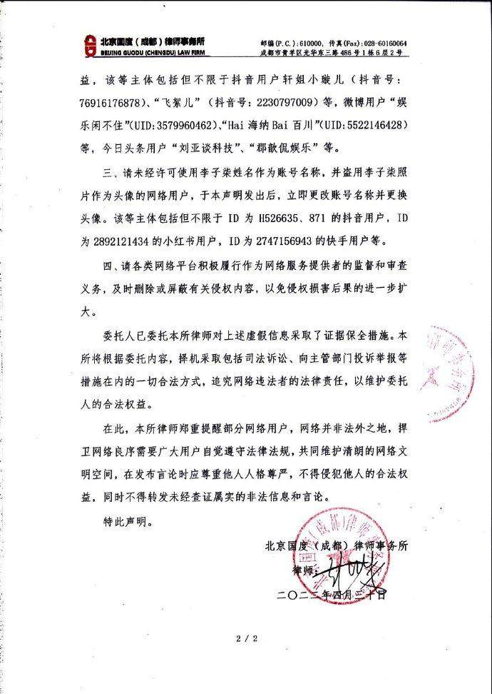 请各类网络平台上恶意发布虚假信息的网络用户,于声明发出后,立即主动删除相关视频文章,并立即停止侵害李子柒合法权益。