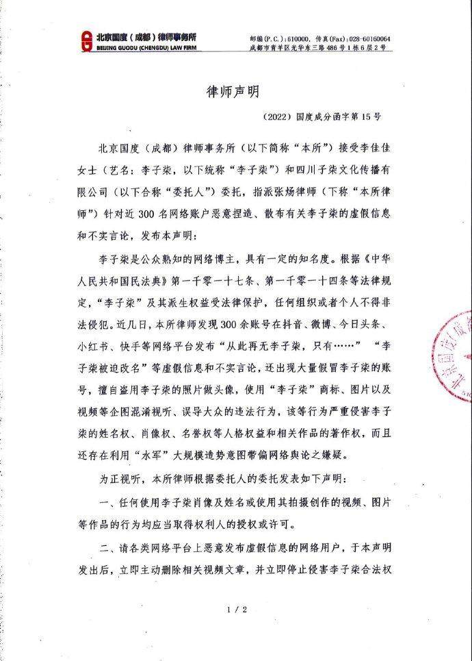 IT之家了解到,声明称近几日发现 300 余账号在抖音、微博、今日头条、小红书、快手等网络平台发布“从此再无李子柒,只有……”“李子柒被迫改名”等虚假信息和不实言论,还出现大量假冒李子柒的账号,擅自盗用李子柒的照片做头像,使用“李子装”商标、图片以及视频等企图混淆视听、误导大众的违法行为,该等行为严重侵害李子柒的姓名权、肖像权、名誉权等人格权益和相关作品的著作权,而且还存在利用“水军”大规模造势意图带偏网络舆论之嫌疑。