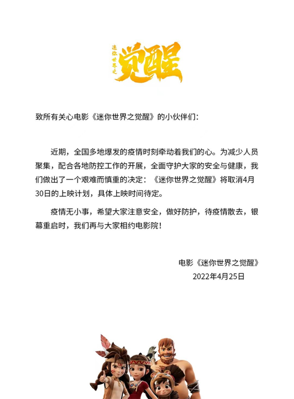 到了4月25日,动画电影《迷你世界之觉醒》《我是霸王龙》也相继撤档,截至当时,共计8部影片选择了撤档。