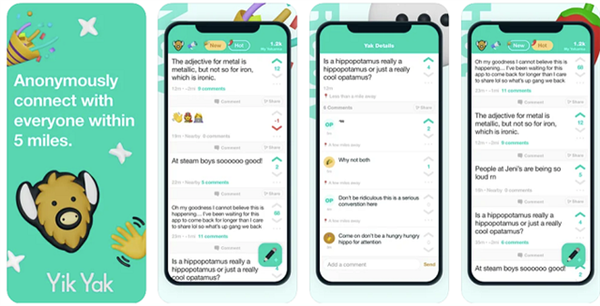 YikYak打造基于地理位置的生态,用户全员匿名,发布的内容只有半径5英里以内的人可以看到、点赞和评论。