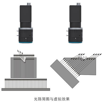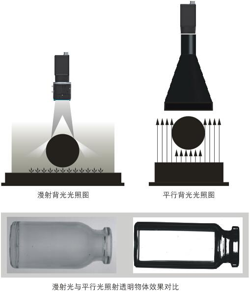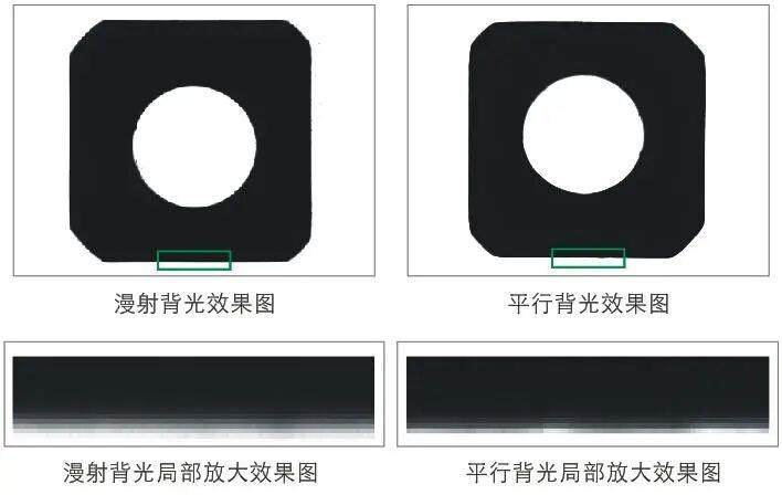 漫射光方向比较散乱,被瓶身折射后依然是杂散光,整体上比较均匀,瓶子轮廓与背景对比不明显。平行光照射情况下,边缘区域将光线折射到镜头入瞳之外的区域,显示为黑色,与背景对比很明显。使用漫射背光测量,由于侧部光线被反射进入镜头,会出现上图所示的“发虚”现象,过渡像素较多,无法满足高精度测量要求,影响测量的精度。使用同样大小的平行背光测量,全部光线方向统一,图像边缘很锐利,像素过度减少。同时配合远心镜头使用,可以提高成像稳定性和精度,也可进一步减少环境杂散光的干扰。