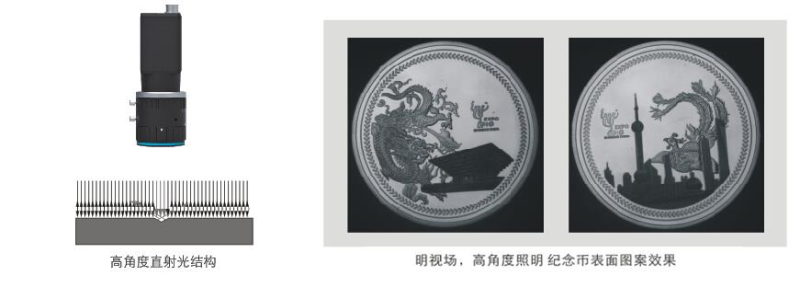 结构描述:高角度照射,表面平整部位反光比较容易进入镜头,图像亮度较高;不平整部位反光杂乱,部分光线进入不到镜头,图像亮度较低。主要应用:表面细微划伤检测,打标字符检测与识别,表面异物检测,边缘尺寸测量,定位,冲压,浇铸字符图案监测与识别等项目。优点:效果明显,细节清晰。缺点:均匀性调节有一定难度。常用光源:高角度环形光、条形光、面光源、同轴光、点光。高角度光源照射,图像背景为白色,即明场照射,可以显现物体表面平整区域的轮廓特征,表面比较杂乱的划伤、阶梯等特征也可以显示出来,表面粗糙程度不同或光反射率不同的区域也会有明显差异。