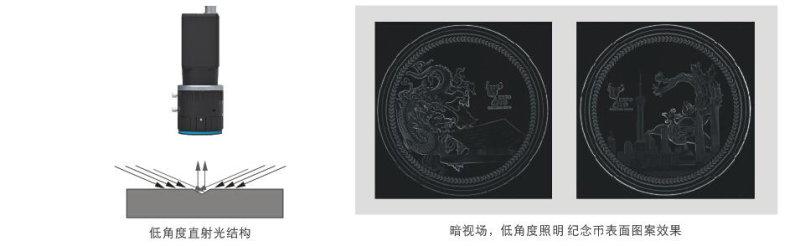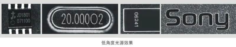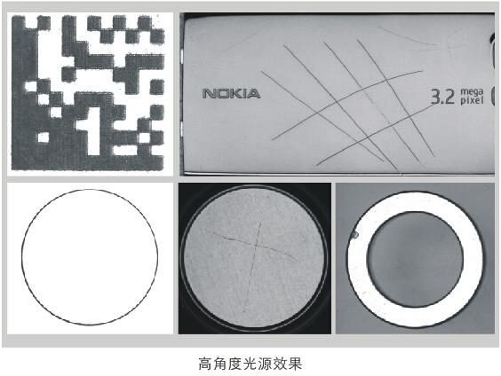 结构描述:低角度照射,表面平整部位反光无法进入镜头,图像亮度较低;不平整部位反光进入镜头,图像亮度较高。主要应用:表面划伤检测,打标字符检测与识别,表面异物检测,边缘尺寸测量,定位,倒角测量,冲压,浇铸字符图案检测与识别等项目。优点:便于安装、效果稳定。缺点:透明物质、表面划伤边缘起毛的效果不明显,有些情况下现场要求光源必须处于一定高度之上,影响效果。常用光源:条形光、线形光、低角度环形光等。低角度光源照射,图像背景为黑色,即暗场照明,可以显现物体边缘倒角等45~60°的坡度信息,表面比较杂乱的碰伤、划伤、雕刻特征也可以显示出来。