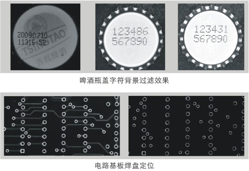与物体表面自然色相同或相近颜色的光照射到物体上之后,反射率比较高;对比色照射,则反射率较低。利用这一原理,可以实现加强图像效果、过滤背景干扰的目的。右图为啤酒瓶盖子,检测目标是上面的喷码,每种盖子会有不同的背景色和图样,如第一幅所示,第二幅和第三幅所使用盖子为蓝色和绿色背景。选择和背景颜色一致的光源照射,即可获得图中的效果,背景被过滤掉或者大幅削弱,字符检测和识别不再受干扰。