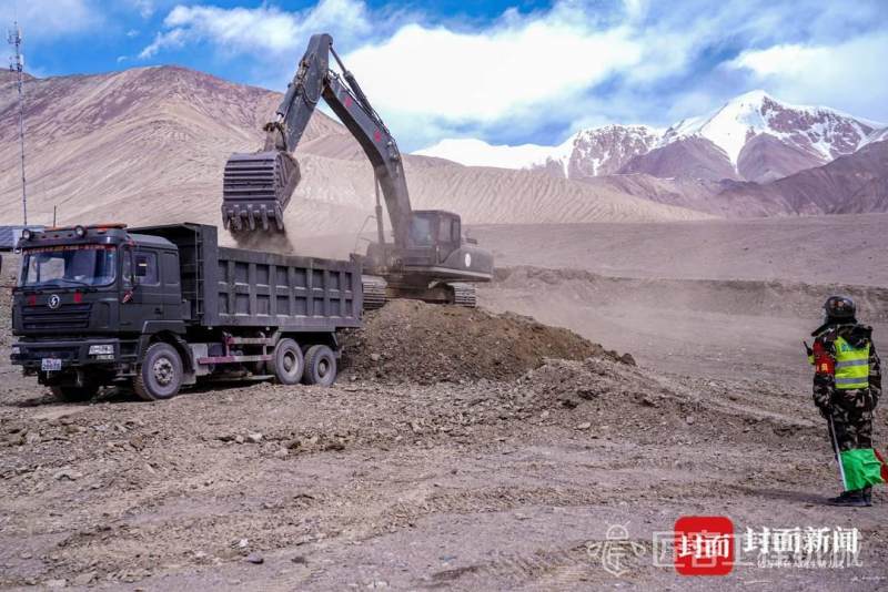 挖掘机开挖土方,装载机跟进作业,自卸车往来穿梭......修复“天路”的过程中,官兵手挑肩扛,安全员全时警戒,指挥员协调指挥,人装结合、多机协同,武警官兵井然有序地进行工作。