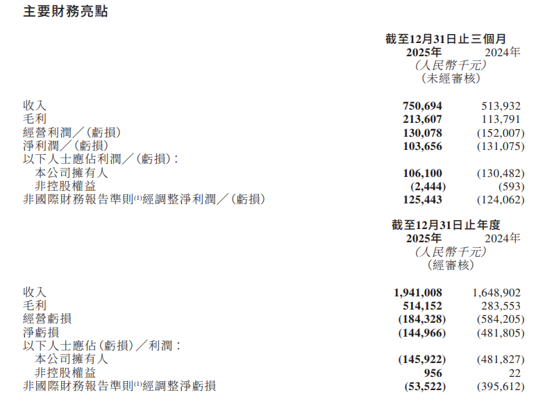 2025年全年总收入为人民币19.41亿元,同比增长17.7%;全年激光雷达总销量约91.2万台,同比增长67.6%;2025年全年综合毛利率提升至26.5%,较2024年提升9.3个百分点,全年毛利同比增长81.3%;2025年全年净亏损大幅收窄至人民币1.45亿元(2024年亏损4.82亿元),非国际财务报告准则经调整净亏损进一步收窄至人民币5352.2万元。