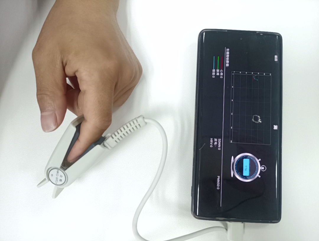 HKG-07CA充分借助智能手机的Type-C接口与OTG功能。用户无需额外电源或专用转接头,只需将传感器插入手机接口,配套APP即可通过安卓系统的USB Host API识别设备并自动建立串口通信;测量时将传感器夹体固定于指尖,即可启动稳定的信号采集,无需手动按压保持姿势,大幅降低了使用门槛,符合移动终端“无感操作”的产品原则。
