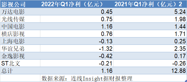 据连线Insight统计,万达电影、光线传媒、中国电影、横店影视、上海电影、华谊兄弟、金逸影视和ST北文等八家影视制作公司,第一季度的累计总净利润仅1.16亿元。