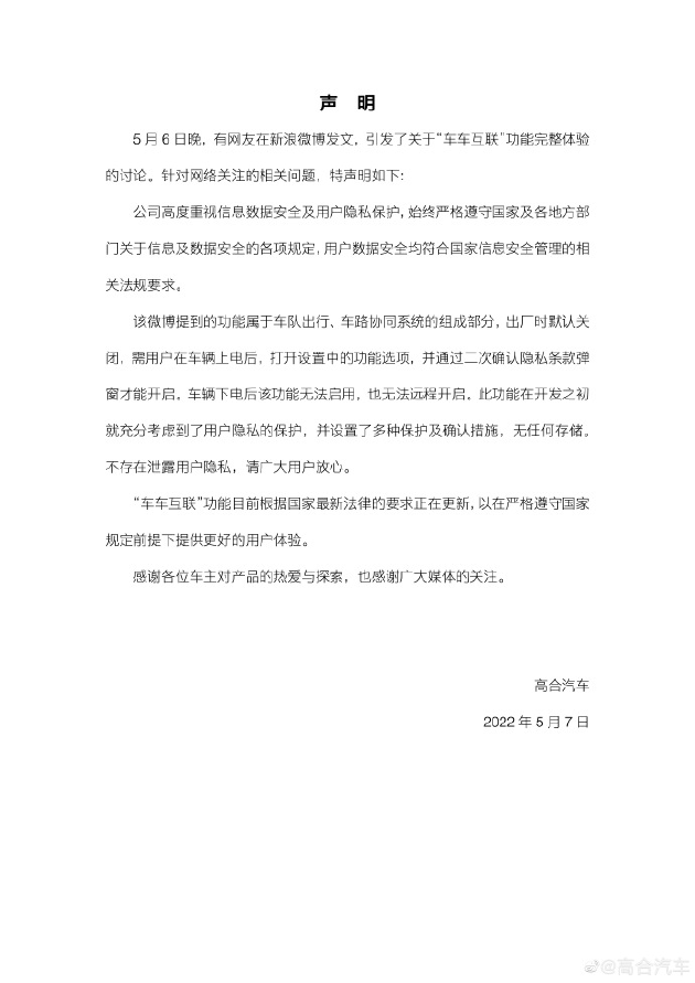 该微博提到的功能属于车队出行、车路协同系统的组成部分,出厂时默认关闭,需用户在车辆上电后,打开设置中的功能选项,并通过二次确认隐私条款弹窗才能开启。车辆下电后该功能无法启用,也无法远程开启。此功能在开发之初就充分考虑到了用户隐私的保护,并设置了多种保护及确认措施,无任何存储。不存在泄露用户隐私,请广大用户放心。
