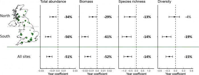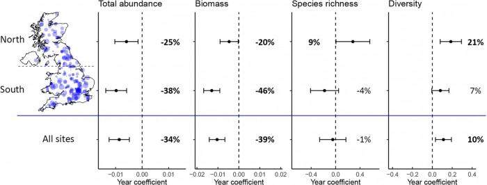 Buglife调查发现,每英里昆虫数量降幅最大的是英格兰(65%),其次是威尔士(55%),降幅最小的是苏格兰(27.9%)。Shardlow表示,造成这种区域差异的原因可能是北部地区光污染较少、杀虫剂使用量较小(由于耕地较少),以及气候变化影响较小。