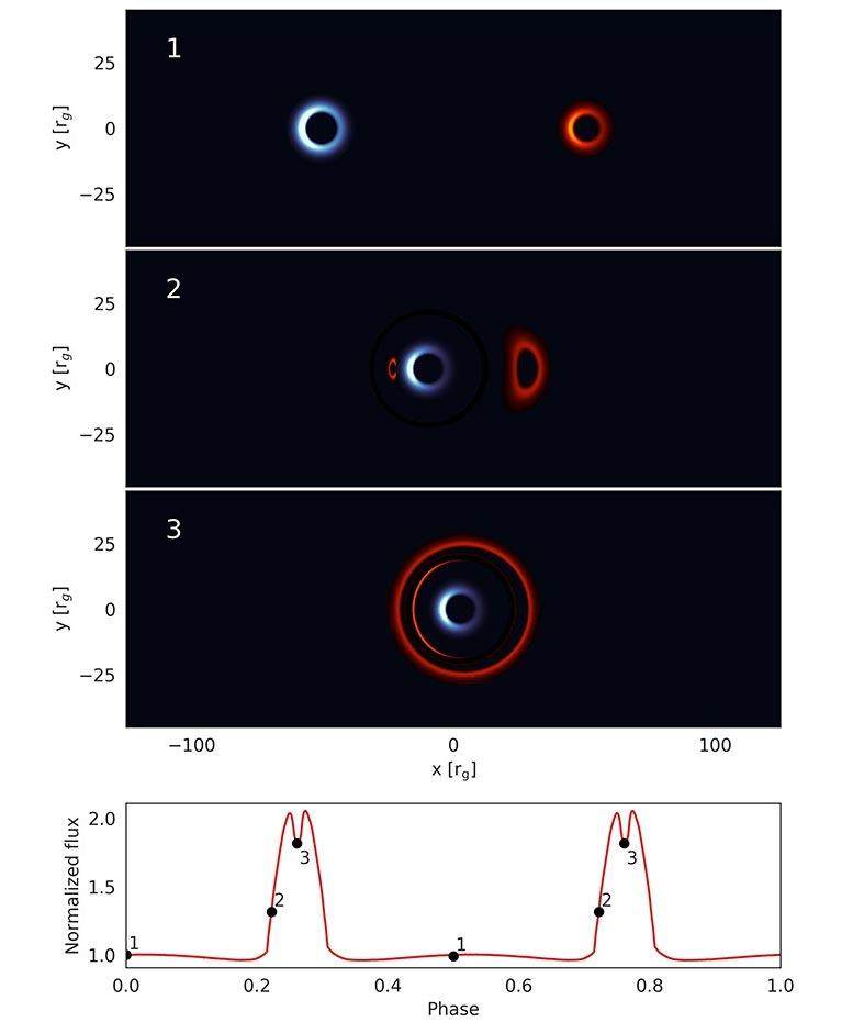 当他们寻找一个物理机制来解释它时,他们意识到每次亮度的下降都跟最靠近观察者的黑洞从后面的黑洞的阴影前面经过的时间密切相关。