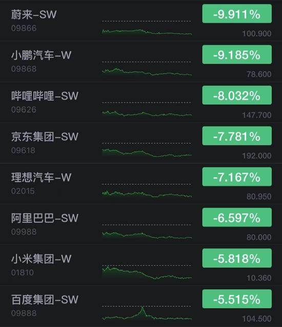 5月12日下午消息,香港恒生指数收跌2.24%,恒生科技指数跌3.84%。大型科技股普跌,蔚来汽车港股收跌近10%,小鹏汽车跌超9%,哔哩哔哩跌超8%,京东集团、理想汽车跌超7%,阿里巴巴跌超6%,小米集团、百度跌超5%。