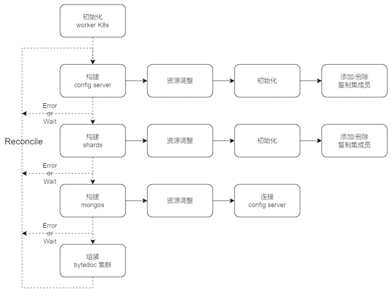 再仔细探究一下,ByteDoc 集群分为 3 个组件,只要 Mongos、config server、shard 三个组件都达到期望状态,最后将组件“连接”起来,整个集群也达到期望状态了;