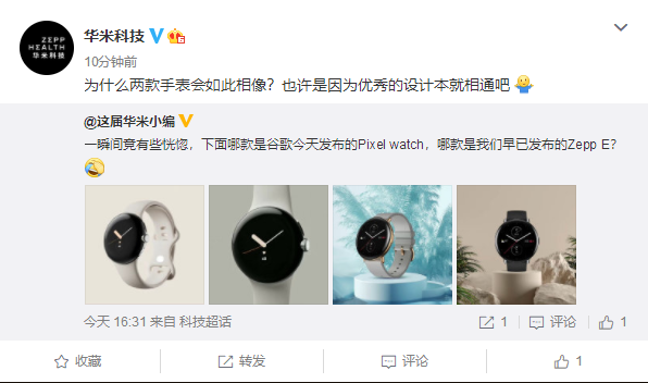 对于这款手表,国内智能手表厂商华米发话了:咋跟我们如此相像呢?也许是因为优秀的设计本就相通吧。