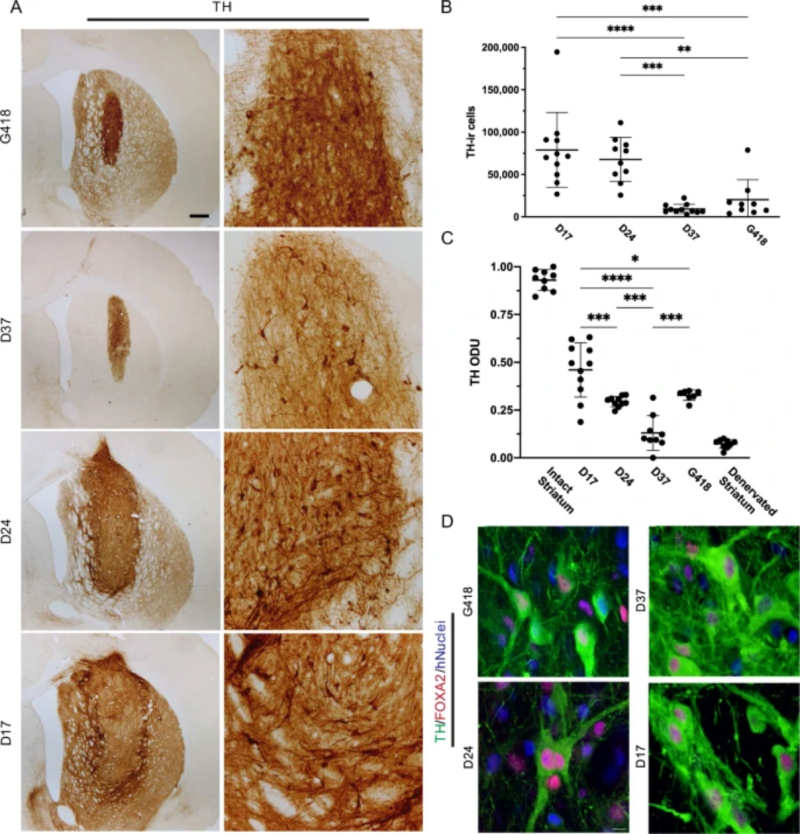 另外,剂量也被发现是关键,少量干细胞的影响可以忽略不计,而大量的干细胞则进入大脑并跟神经组织结合,然后形成突触并产生多巴胺。最终,这使得接受治疗的老鼠完全逆转了帕金森病的症状。