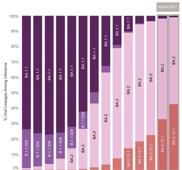 以 BA.2.12.1(红色条柱)为例,过去的几周,它在美国一直蚕食着原本是 BA.2 的势力范围,马上就要达到感染半数占比了。